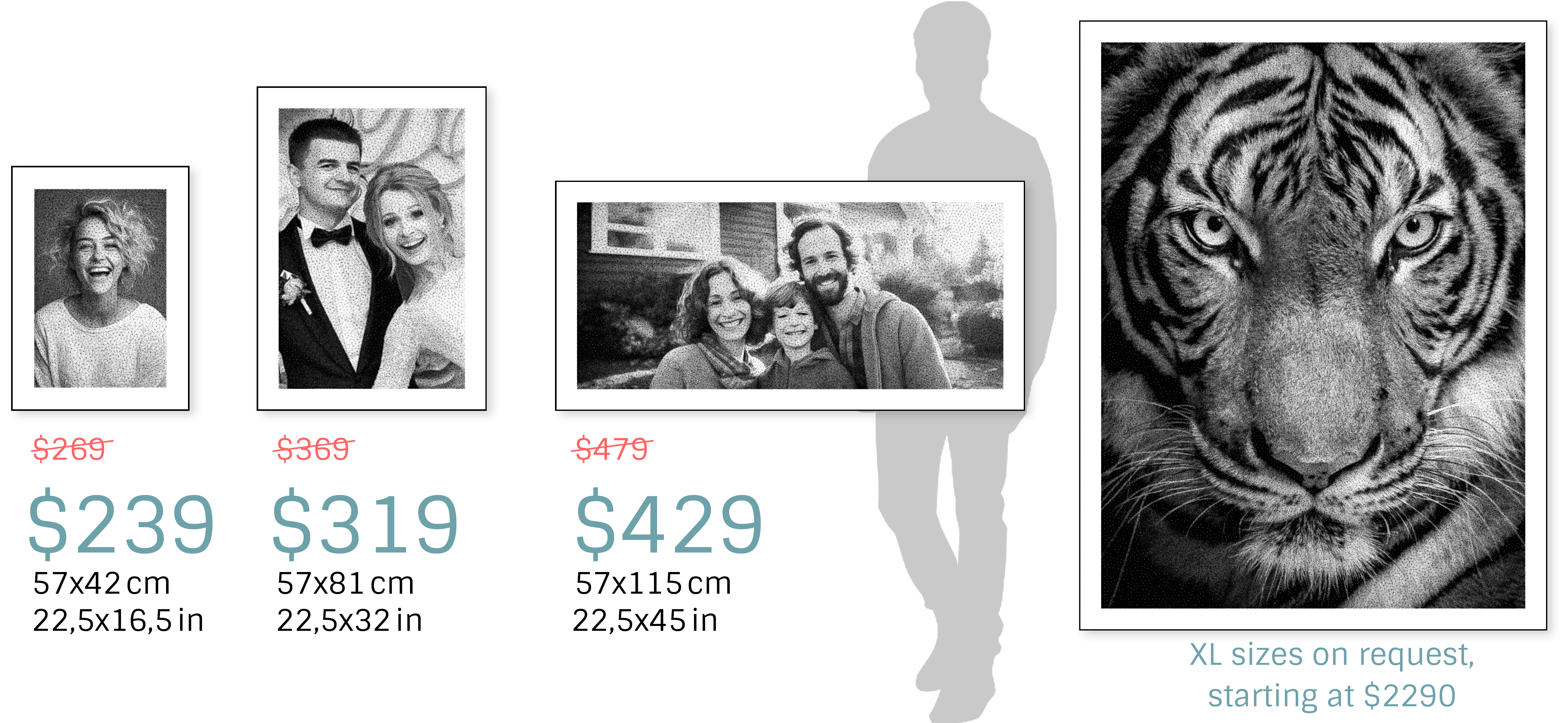 The nail density is the same for all formats, i.e. we always use the same number of nails per surface. The viewing distance from which the motif looks like a black and white photo is therefore independent of the image size.