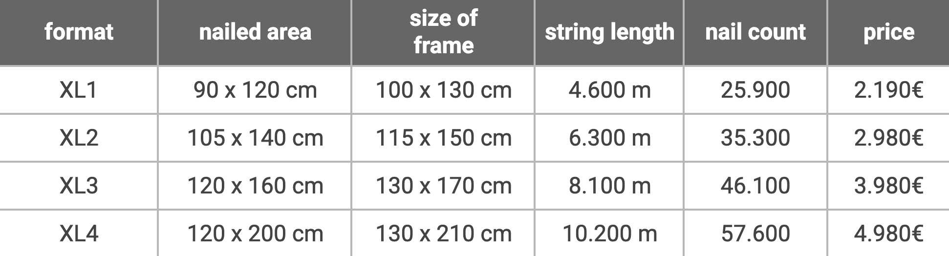 The price of an XL picture is therefore about double to triple the price per square meter of nailed area compared to an picture from the configurator.