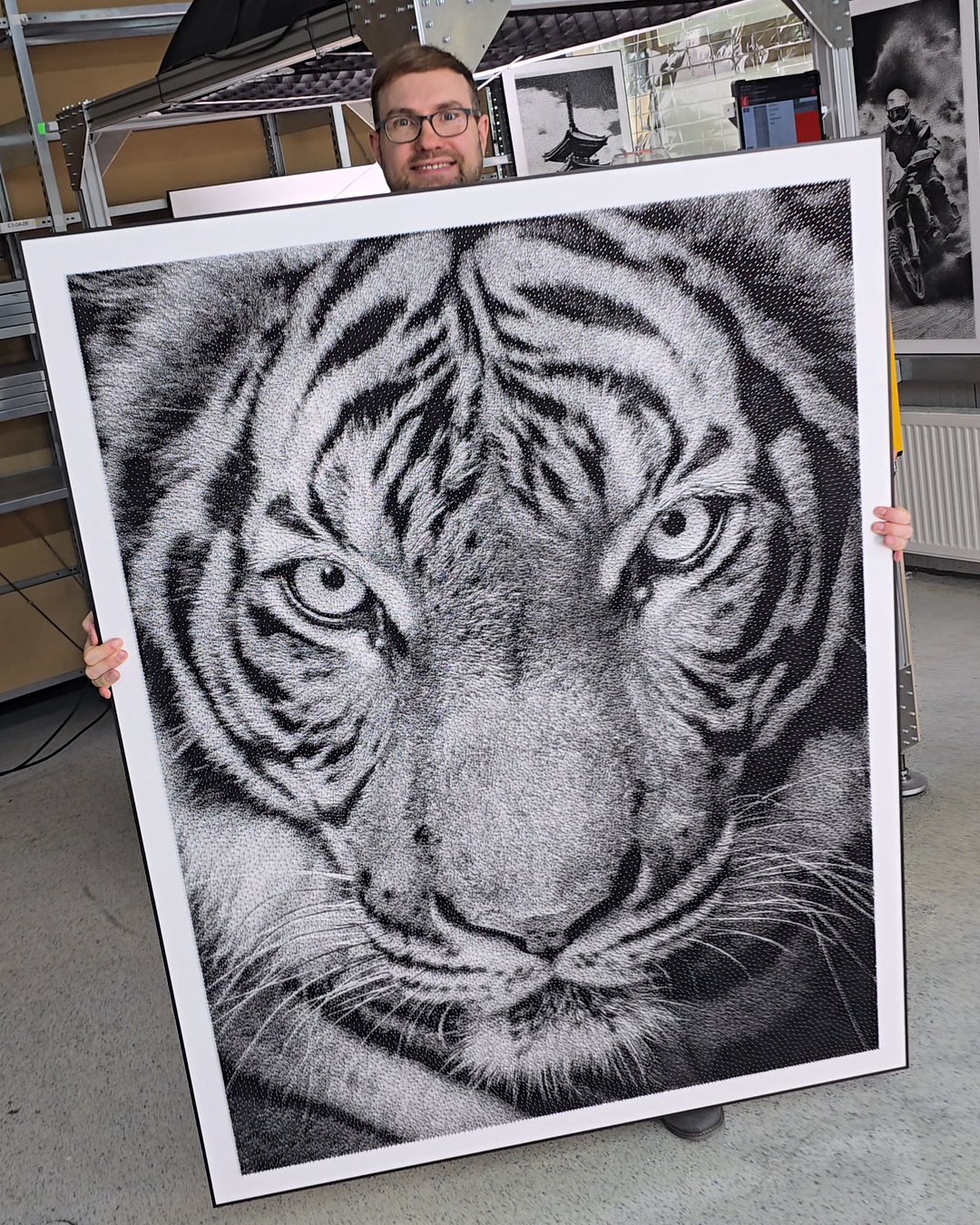 We can't produce our XL formats as automatically as the smaller formats from the configurator . Instead, we rely on meticulous attention to detail. The XL images must be manually rotated and turned several times in our robot to process the entire surface. In each step, the base plate is aligned with extreme precision, and every single nail is checked, ensuring that no seam is visible later and the picture appears as if it were produced from a single piece.